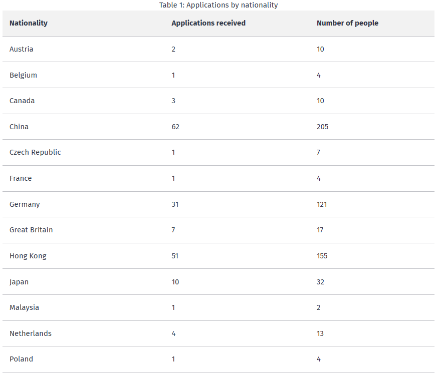 截至10月31日,移民局已根据新政策收到401份申请,涉及1288名申请人,其中76份属于“平衡型”类别,325份属于“增长型”类别。
