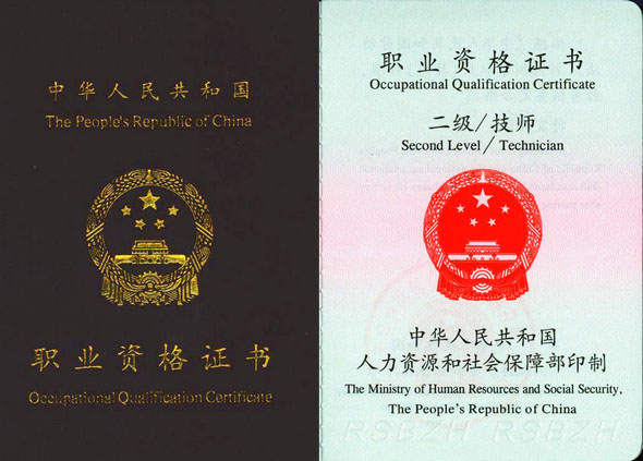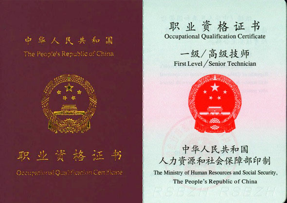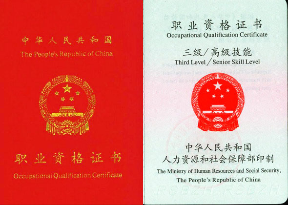 tip: 新版国家职业资格证书同护照,中英文对照,相片内页打印压膜,增加防伪条形码,原签发部门及印章由"劳动和社会保障部职业技能鉴定中心"统一变更为"人力资源和社会保障部职业技能鉴定中心",证书编号唯一,网上可查。根据"人社鉴发[2009]001号"通知的要求,凡赴境外就业和对外劳务合作,必须换新版中英文对照职业资格证书,所以建议原旧版证书去当地鉴定所换新。